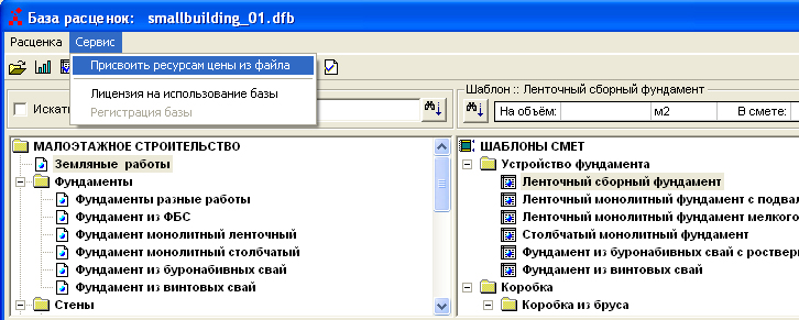 Для присвоения цен из файла расценкам базы, нужно открыть форму базы и воспользоваться командой "Присвоить ресурсам цены из файла" меню "Сервис".
