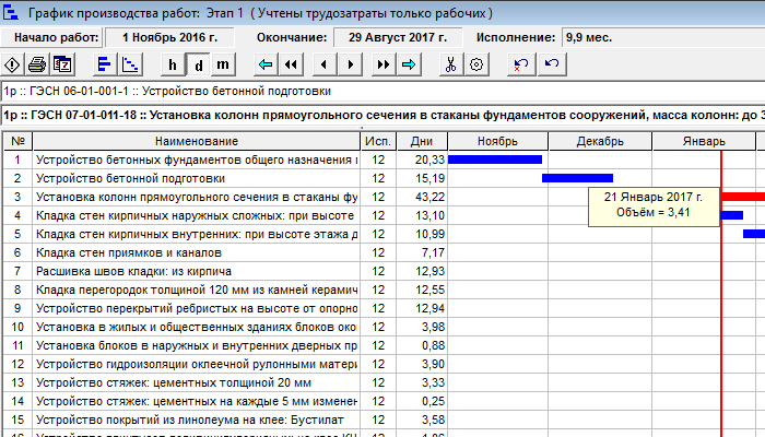 Опираясь на трудозатраты заложенные в расценки, программа автоматически строит график производства работ. График получается туповатый, так как работы идут друг за другом, но, указав среднее количество исполнителей на объекте, Вы получите достаточно точное время выполнения работ.