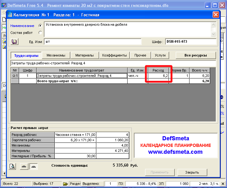 Если Вы не согласны с той трудозатратой, которая заложена в расценку, нужно просто изменить её значение, на картинке выделено красным квадратом.