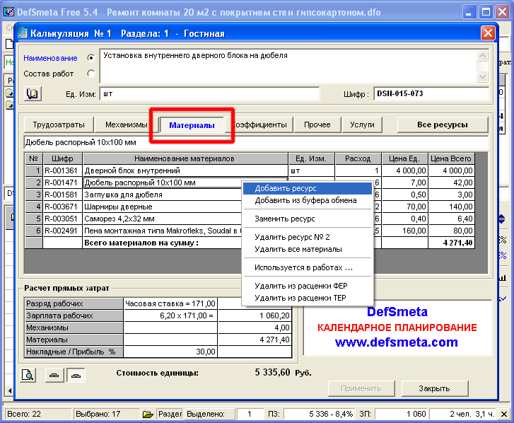 Если Вы не нашли в списке нужный ресурс, введите наименование материала и нажмите клавишу "Enter". Затем установите его расход и стоимость.