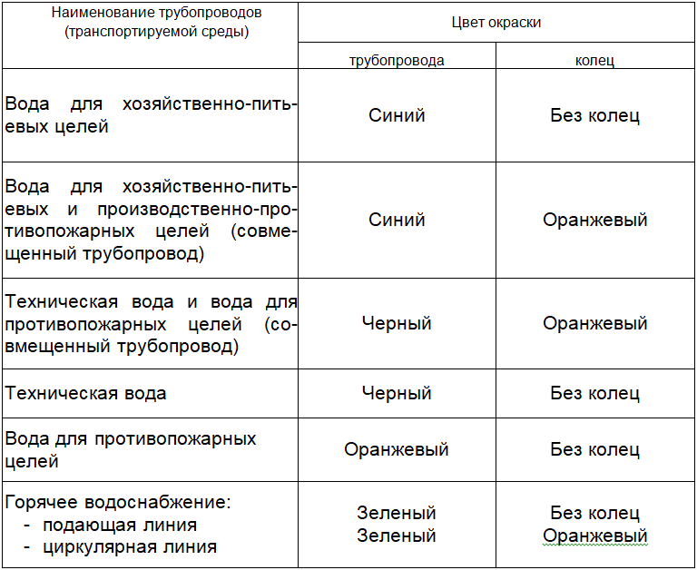 Трубопроводы из стальных труб, транспортирующие холодную воду в помещениях, где имеется возможность выпадения конденсата, покрываются противокоррозионной изоляцией, тепловой изоляцией и окрашиваются. Трубопроводы, на которых исключено выпадение конденсата, окрашиваются масляной краской за два раза в условные цвета (Таблица 5.2).