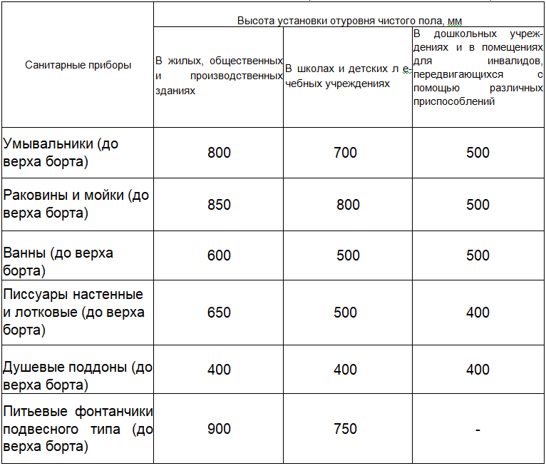 Высота установки санитарных приборов от уровня чистого пола назначается в соответствии с таблицей 5.5.