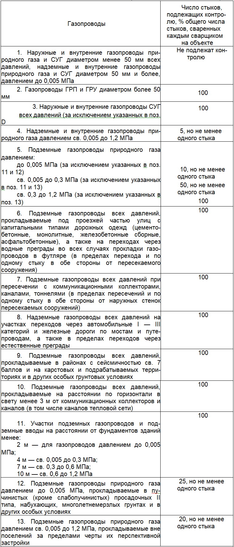 2. Нормы контроля по поз. 4 не распространяются на газопроводы, указанные в поз. 8, по поз. 5, 12 и 13 — на указанные в поз. 6 и 7; по поз. 13 — на указанные в поз. 9.