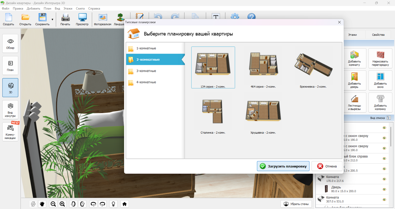 1. Выберите макет из каталога или создайте свой. В программе предусмотрены шаблоны квартир с популярными планировками. Если расположение стен или какие-то размеры отличаются, просто отредактируйте их.