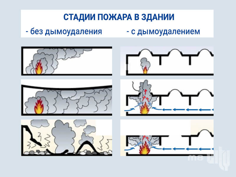 - Снижение уровня задымления помещения при эвакуации, что повышает ее эффективность;